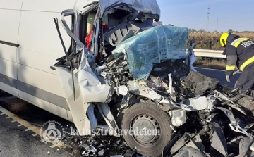 Egy nyerges vontató a középső szalagkorlátot átszakítva, a szembejövő sávban az oldalára borult.