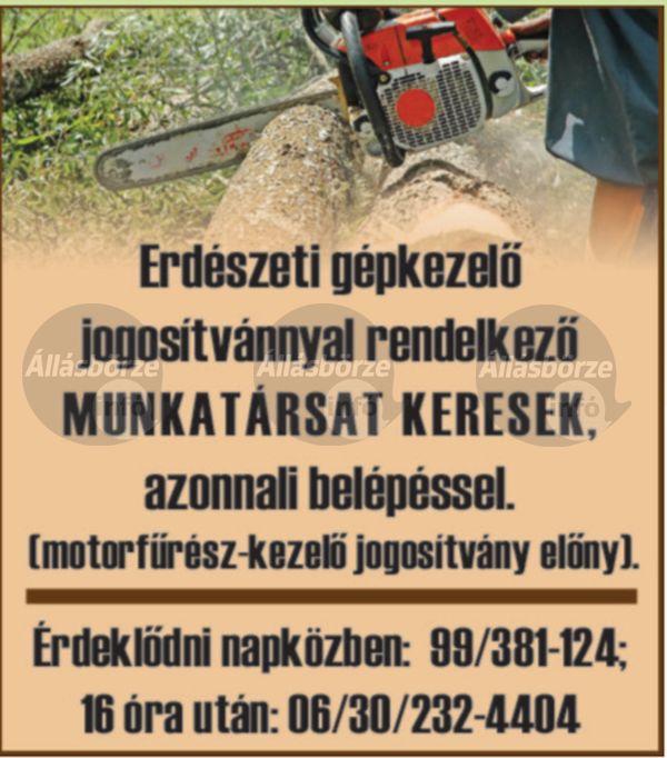 Erdőművelési munkára munkatársakat keresünk Kapuvárról és környékéről. 06-20/450-3123