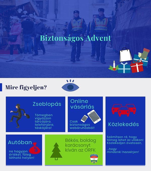 Az év végi ünnepek közeledtével a főbb közlekedési útvonalakon, valamint a bevásárló- és üzletközpontok környékén megnövekszik a személy- és gépjárműforgalom. A rendőrség az adventi időszakban kiemelt figyelmet fordít az olyan nagy tömegeket vonzó helyszínek ellenőrzésére, ahol nagyobb eséllyel válhatunk vagyon elleni jogsértés áldozatává.