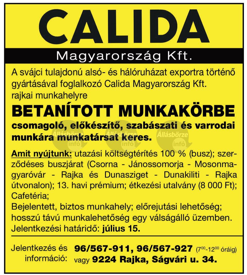 Jánossomorjára keresünk 2 műszakos munkarendbe gépbeállítókat. Az utazás Mosonmagyaróvárról, Csornáról. Bősárkányból céges járattal megoldott.( más településekről a bejárást térítjük).Önéletrajzokat abraham.nikolett@worldjob.hu címre várjuk. Érd.: +36 80/200-218, +3630/530-4028 Nyilv.szám: 10/2011