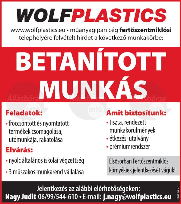 Fertőszentmiklósi munkahelyre várjuk női munkaerő jelentkezését teasütemények gyártására és csomagolására! Útiköltséget térítünk! Jelentkezés a 30/193-5811-es telefonszámon vagy a fertoszentmiklos@memeszosz.hu e-mail címen.