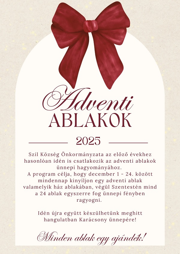 Szil Község Önkormányzata 4. alkalommal is meghirdeti az adventi ablakok kezdeményezést. December 1 és 24 között élő adventi kalendárium jelzi a Karácsony közeledtét. Idén is szeretnék, ha község együtt várná az ünnepeket, közösen készülődhetnének lélekfeltöltő beszélgetésekkel és forralt borozással.