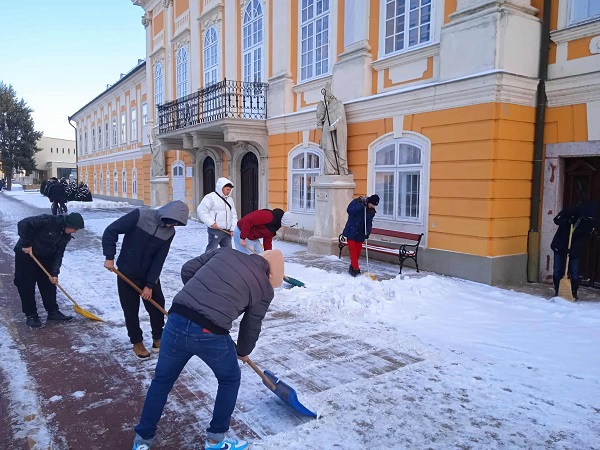 A diákok ma Csorna közterületeit tisztították meg a hótól.