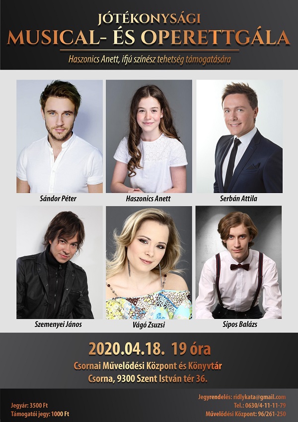 Más módon is tudjuk segíteni Anettet. 2020. április 18-án szombaton este 19 órakor a csornai Művelődési Központban Haszonics Anett támogatására jótékonysági musical- és operett gála lesz. Ezen az estén Anett is fellép az ismert művészek mellett. Jegyeket a csornai művelődési központban tudnak venni 3500 Ft áron. Támogatói jegyeket is lehet venni Anett édesanyjánálannak, aki nem tud eljönni, vagy még a jegy mellett is támogatni szeretné Anettet.