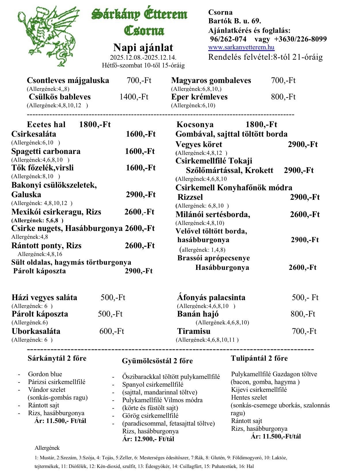 A. menü: 2.400 Ft, B. menü: 2.600 Ft