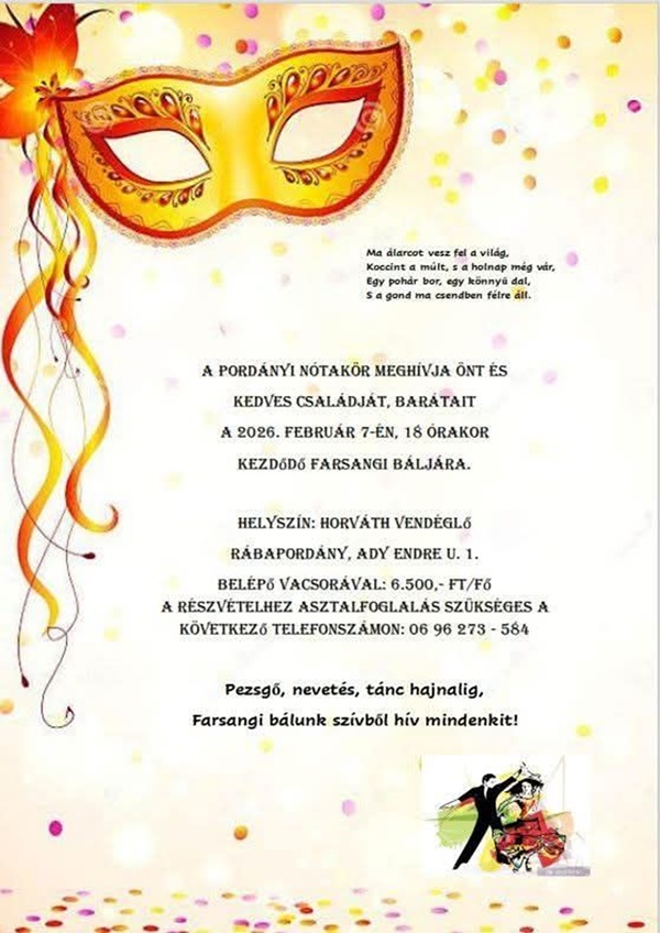 A Pordányi Nótakör szeretettel meghívja Önt és kedves családját, barátait a 2026. február 7-én (szombaton) 18:00 órakor kezdődő farsangi báljára!