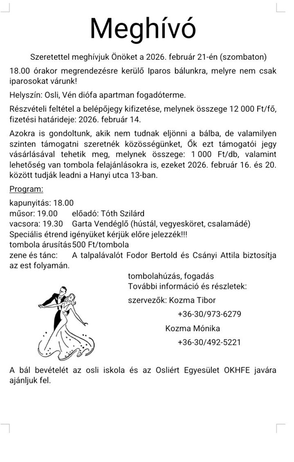A bál bevételét a szervezők az osli iskola és az Osliért Egyesület OKHFE javára ajánlják fel.