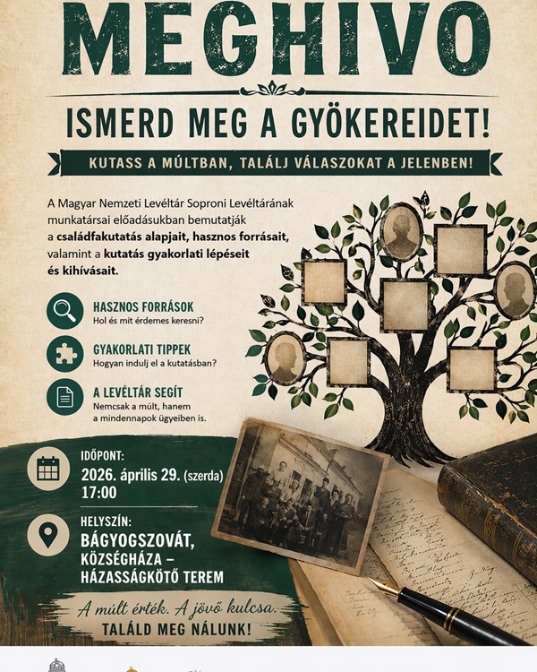 A múlt feltárása és a családi gyökerek megismerése kerül a középpontba azon az előadáson, amelyet a Magyar Nemzeti Levéltár Soproni Levéltárának munkatársai tartanak Bágyogszováton.